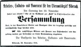 Hinterher weiß man nicht mehr, wie sie zu ihrem Amt gekommen sind, gewählt worden seien sie nicht, "mit der Revolution waren sie einfach da"89. Wo die sozialdemokratische Arbeiterbewegung relativ stark ist, bewährte Parteifunktionäre mit politischer Erfahrung wirkten, nehmen diese die Bildung der Arbeiterräte in die Hand, bezeichnen sich selbst als solche, suchen Mitstreiter, präsentieren sich einer öffentlichen Versammlung in den ersten Revolutionstagen und lassen sich von ihr bestätigen. So ist es in Friedrichshafen, wie auch in Ravensburg. Hier haben die beiden Arbeiterparteien und die Gewerkschaften die Zusammensetzung des Rats ausgehandelt. In beiden Orten finden in den nächsten Wochen Nachwahlen statt, in Friedrichshafen von Angestellten, Beamten und Vertretern der Landgemeinden, in Ravensburg in den beiden Großfirmen Escher-Wyss und Papierfabrik Baienfurt sowie der christlichen Gewerkschaften und der Angestelltenverbände, nicht aber in den Landgemeinden. In Biberach spricht der Vorsitzende mit den Berufsorganisationen die Zusammensetzung ab: mit den konfessionellen Arbeitervereinen, den Hirsch-Dunckerschen Gewerkschaften, dem Gewerbeverein, den kaufmännischen Verbänden, und fordert die "geistigen Arbeiter", Beamte und Bauern auf, Delegierte zu entsenden. In diesen drei größten Städten Oberschwabens ergreifen die linken Arbeiterführer die Initiative. In Saulgau, Ehingen und Waldsee organisieren der Arbeiter- und Soldatenrat Ravensburg, in Wangen wohl der Arbeiter- und Soldatenrat Friedrichshafen die Wahlversammlungen. In beiden letzten Städten nehmen die Versammlungen aber einen anderen als den geplanten Verlauf, örtliche selbständige Honoratioren gewinnen die Mehrheit für sich und werden zu Vorsitzenden des Arbeiterrats gewählt. In beiden Fällen finden ebenfalls noch Zuwahlen statt, in Waldsee in Volksversammlungen gewählte Vertreter Aulendorfs und Schussenrieds und Delegierte, also indirekt gewählte Vertreter des Arbeiter- und Bauernrats Wolfeggs, in Wangen wählen die Arbeiter dreier größerer Fabriken und im Dezember heimgekehrte Soldaten in Versammlungen in geheimer Abstimmung zusätzliche Vertreter in den Arbeiterrat. In Saulgau wird der von Ravensburg her veranlasst Arbeiterrat in einer Volksversammlung bestätigt, durch Zuwahlen in den Bezirksgemeinden erweiterte er sich zu einer Vertretung aller Berufsgruppen und der Gemeinden. In zwei von den drei Städten bzw. Bezirken, in denen die Initiative zunächst von außen kam (Waldsee, Wangen), setzen sich dann aber doch die örtlich herrschenden politischen Kräfte durch, während in Saulgau der Vorsitzende, bezeichnenderweise ein Amtsgerichtssekretär, also ein bürgerlich reputabler Mann, sich trotz seiner Sympathien für die SPD behaupten kann. In Ehingen scheitert der erst spät am 13. Dezember unternommene Versuch, in einer SPD-Versammlung einen Arbeiterrat zu wählen, und gelingt erst am Tag danach in einer Versammlung, zu der auch die bürgerlichen Organisationen mobilisiert hatten. Dort haben sich offenbar dennoch mehrheitlich SPD-Anhänger durchgesetzt, doch wird der Rat auf Dauer in der kleinen Landstadt von seinen Gegnern blockiert und beschränkt sich auf eine rein örtliche Interessenvertretung. In Leutkirch und Riedlingen ergreifen von vornherein örtliche, kirchlich orientierte Organisationen die Initiative, in Leutkirch noch am 10. November in einer Volksversammlung der Zentrums-Landtagsabgeordnete und Sekretär der Christlichen Gewerkschaften, in Riedlingen lädt der Katholische Arbeiterverein zur Wahlversammlung ein. Über Laupheim ist nur bekannt, dass sich dort ein wohl SPD-naher Arbeiterrat "konstituiert" hat.